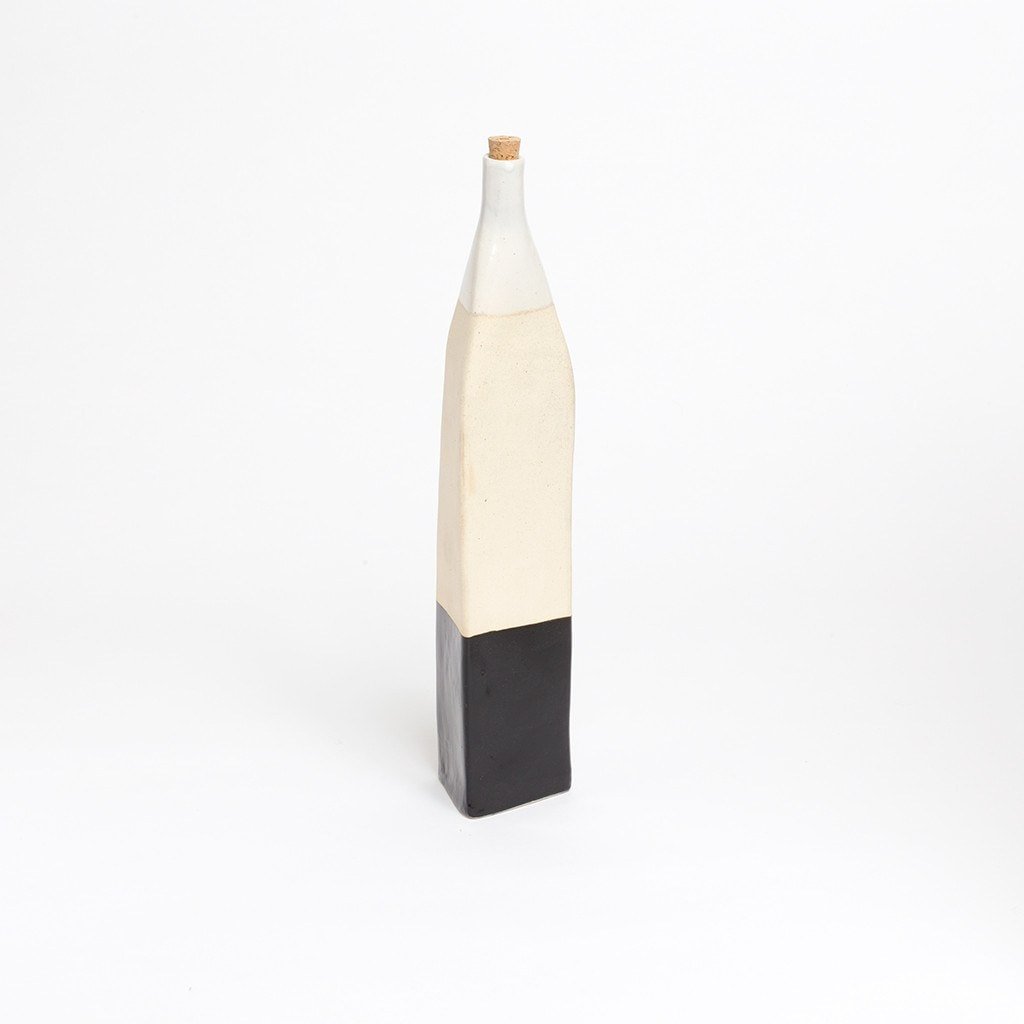 This handmade ceramic bottle is a stunning minimal home decor object handcrafted from Claymen's studio in Delhi, India. The triangular shape features splices of raw clay, matte white and black glaze.