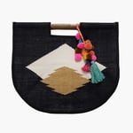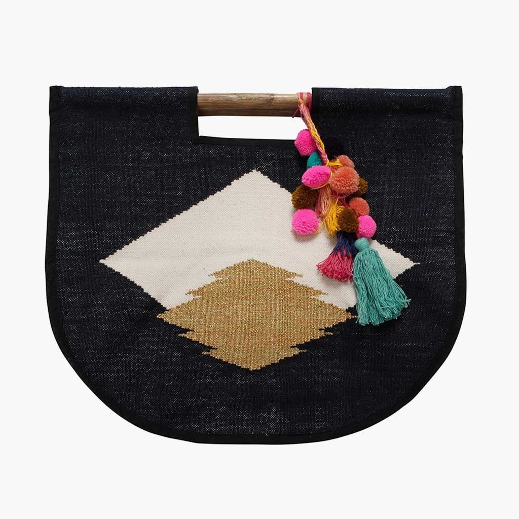 This stylish handwoven women's handbag from Langdon LTD is the perfect day bag for a trip to the shops, markets or the beach. Featuring a striking design with contrast gold metallic detail and colourful pom pom tassel. The smooth wooden handle and large opening makes it super easy to throw in any bits and pieces throughout the day.