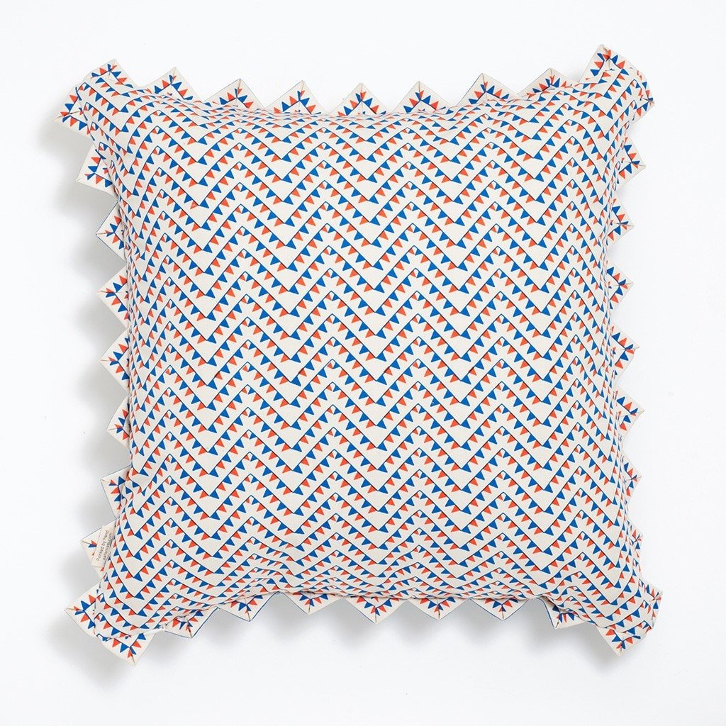 This handmade cushion from Safomasi, features a stunning coastal sail boat illustration designed from their studio in New Delhi. Inspired by designer Sarah Fotheringham's family holidays on the south west coast of England, the print features Regatta boats racing around the estuary. Reversible, the other side features a bunting-inspired Ferry Flag print, which complements design details like the fun flag edging.