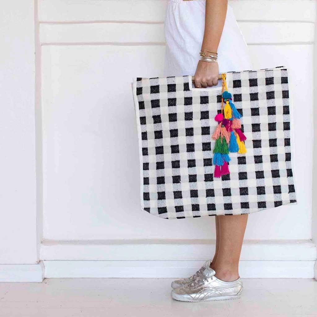 This gorgeous handwoven gingham ladies handbag from Langdon LTD is the perfect day bag, large enough for a trip to the shops, markets or the beach. Featuring a black and white check design with silver metallic detail and colourful pom pom tassel. The smooth bamboo handle and large opening makes it super easy to throw in any bits and pieces throughout the day.