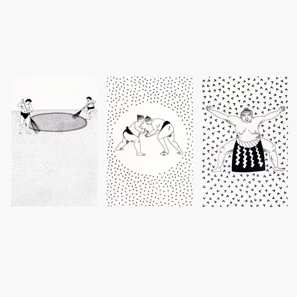 This handmade set of kitchen tea towels from Safomasi, features three unique hand printed illustrations of Japanese Sumo wrestlers. Designed from their studio in New Delhi, each tea towel illustrates a different stage of the match, from sweeping the ring, to mid-wrestle, to the victorious champion celebrating the win.